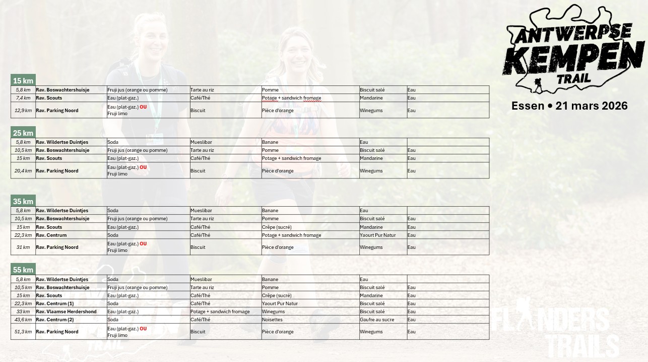 Le pack participant comprend un ravitaillement copieux. Nous proposons une grande variété de produits, tels que des fruits, des biscuits, des barres énergétiques, des sandwichs au fromage, de l'eau, des boissons sucrées, un yaourt etc.